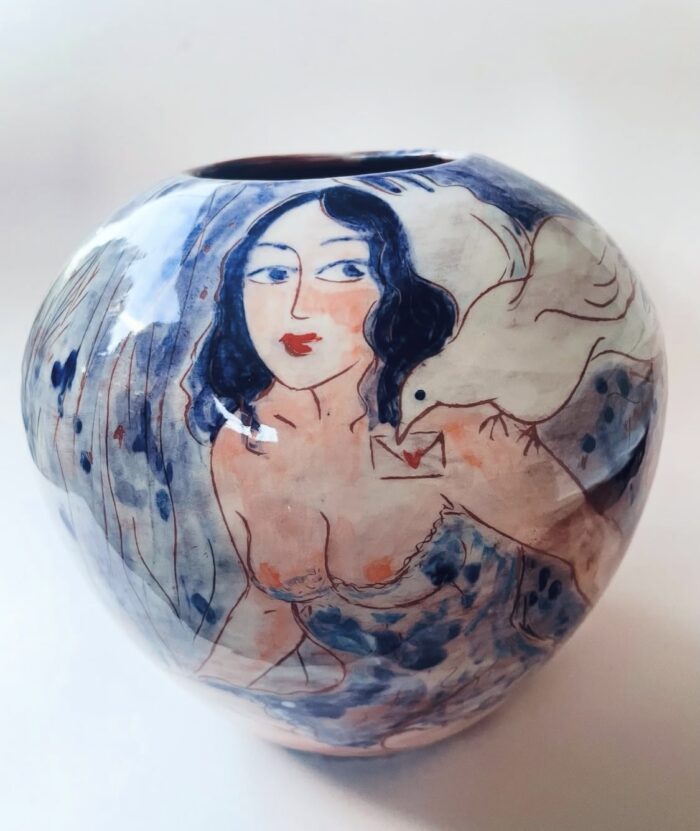 Aquarelles, encres, pastels, céramiques, lustres d’or précieux se mêlent intimement, donnent une couleur singuliere et poétique à ma vie.